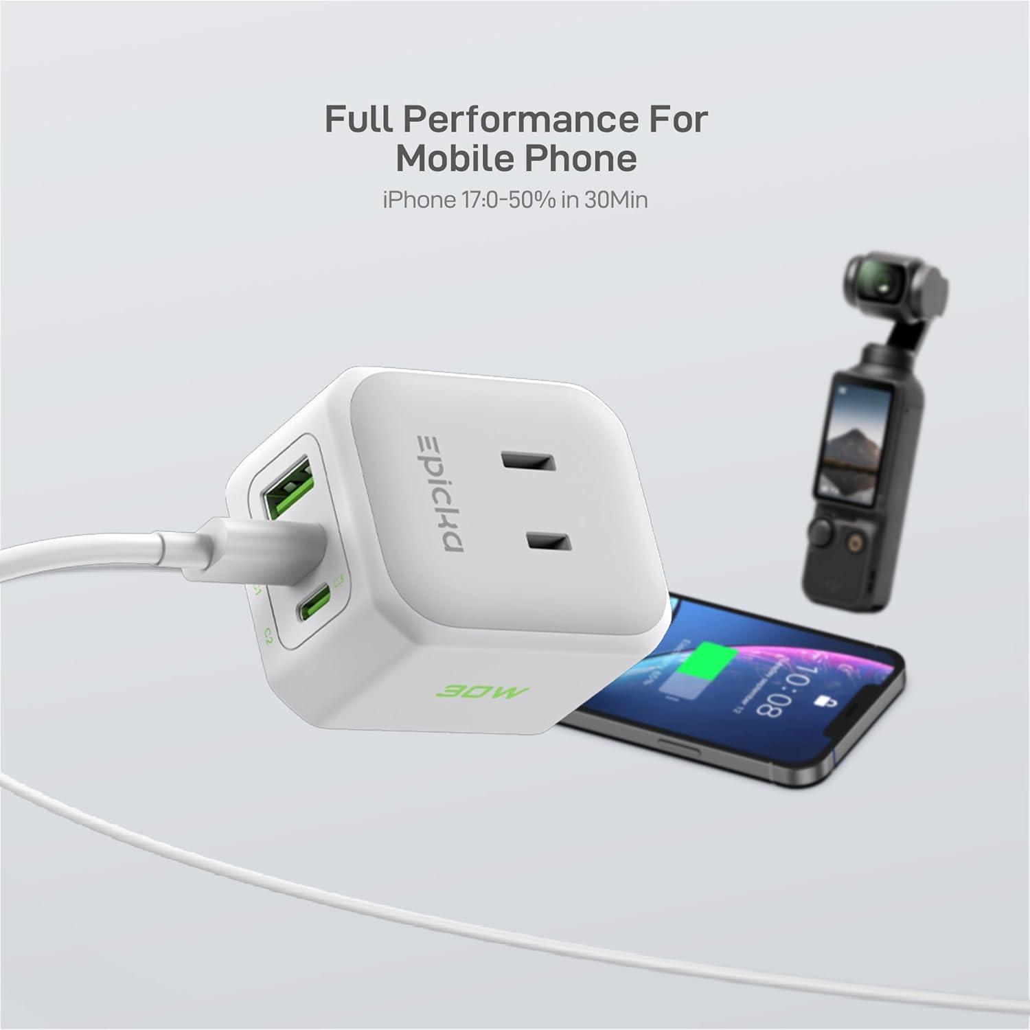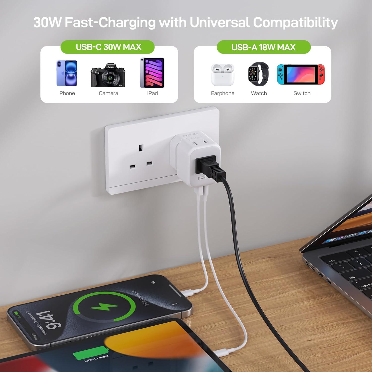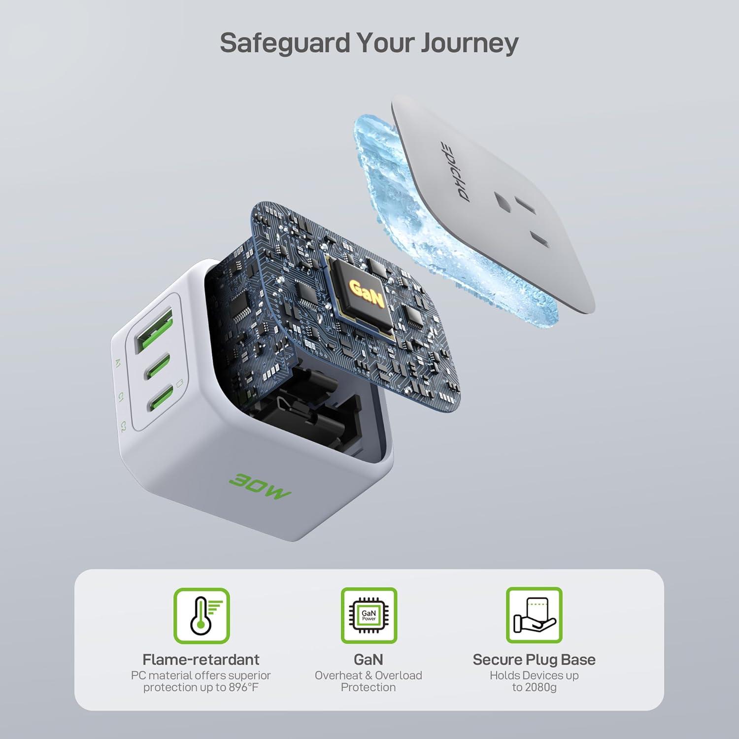 30W PD Fast Charging: This European plug adapter delivers up to 30W total output across USB-C and USB-A ports for efficient, high-speed charging — with both USB-C ports supporting up to 30W fast charge, faster than standard travel adapters.